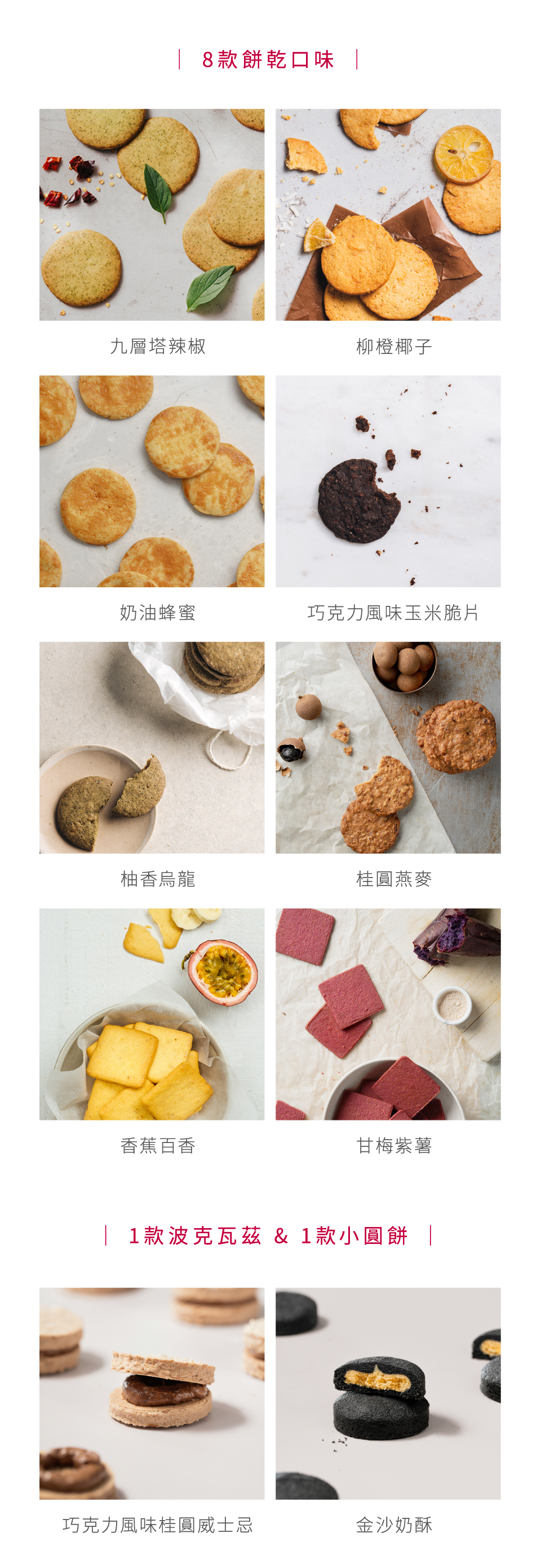 餅乾|巧克力風味玉米脆片、桂圓燕麥、柚香烏龍、奶油蜂蜜風、甘梅紫薯、香蕉百香、九層塔辣椒、柳橙椰子