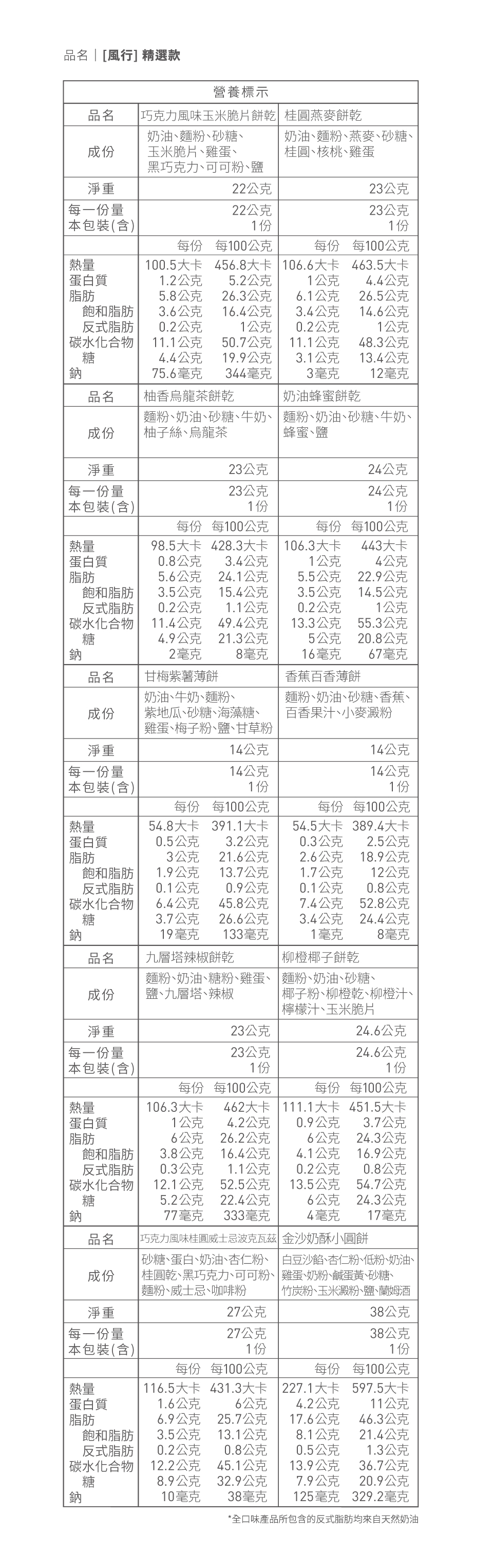 過敏原 |品項皆含麩質穀物(麵粉)、乳製品及雞蛋 (除餅乾: 柳橙椰子、柚香烏龍、奶油蜂蜜、香蕉百香不含雞蛋),桂圓燕麥餅乾及金沙奶酥小圓餅含堅果,巧克力玉米脆片、柳橙椰子、巧克力桂圓威士忌含大豆。