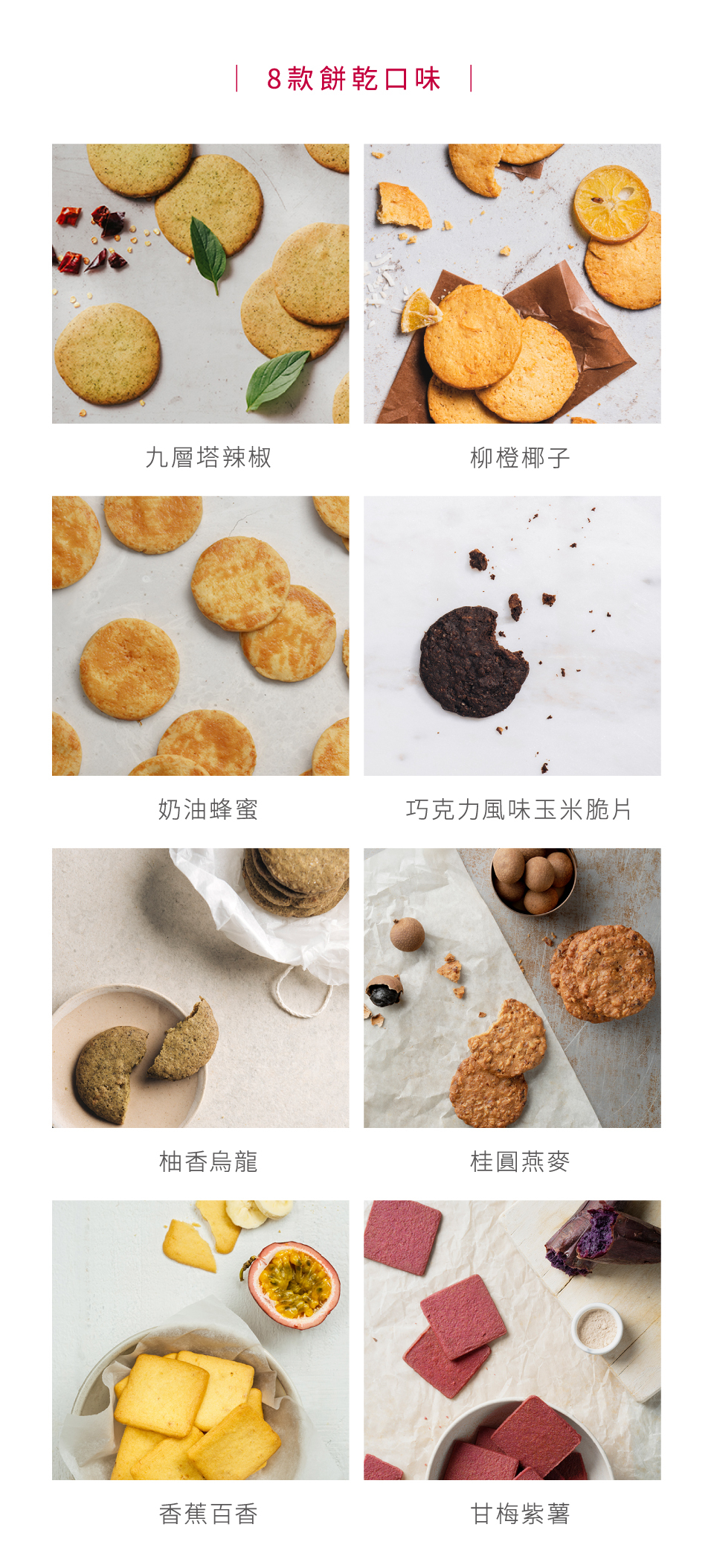 餅乾|巧克力風味玉米脆片、桂圓燕麥、柚香烏龍、奶油蜂蜜風味、甘梅紫薯、香蕉百香、九層塔辣椒、柳橙椰子