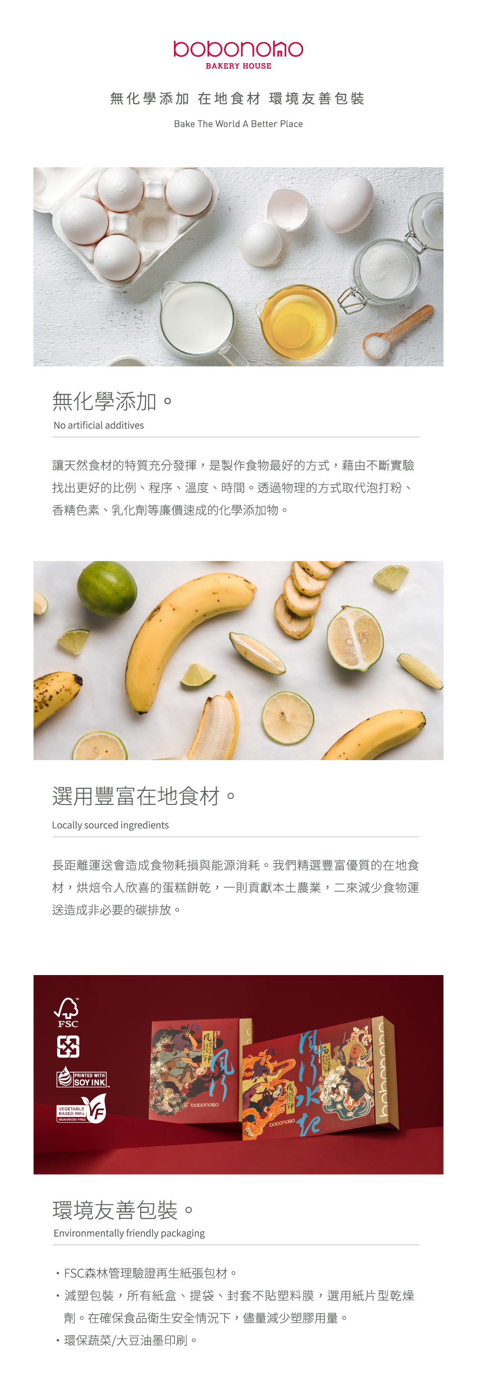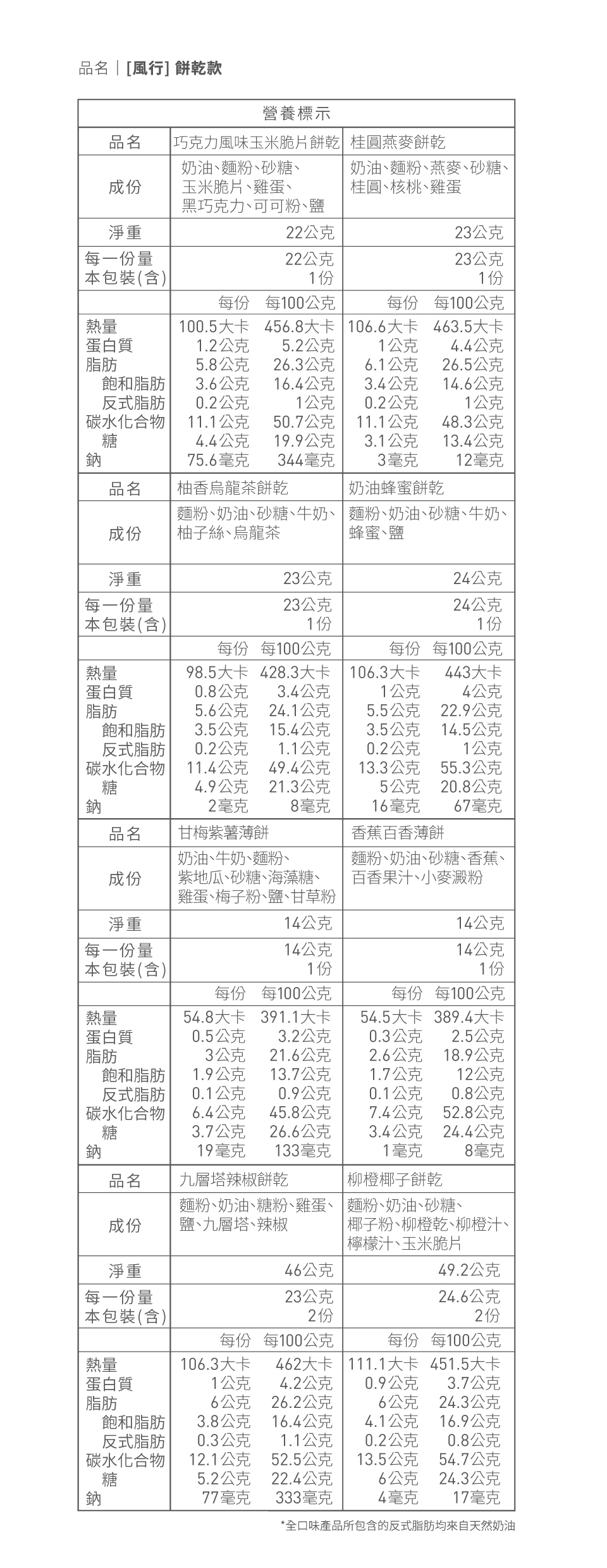 過敏原 | 品項皆含麩質穀物(麵粉)、乳製品及雞蛋(除餅乾:柳橙椰子、柚香烏龍、奶油蜂蜜、香蕉百香不含雞蛋),桂圓燕麥、柳橙椰子含堅果,巧克力玉米、柳橙椰子含大豆。