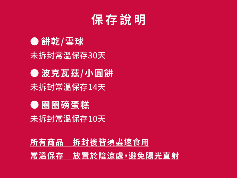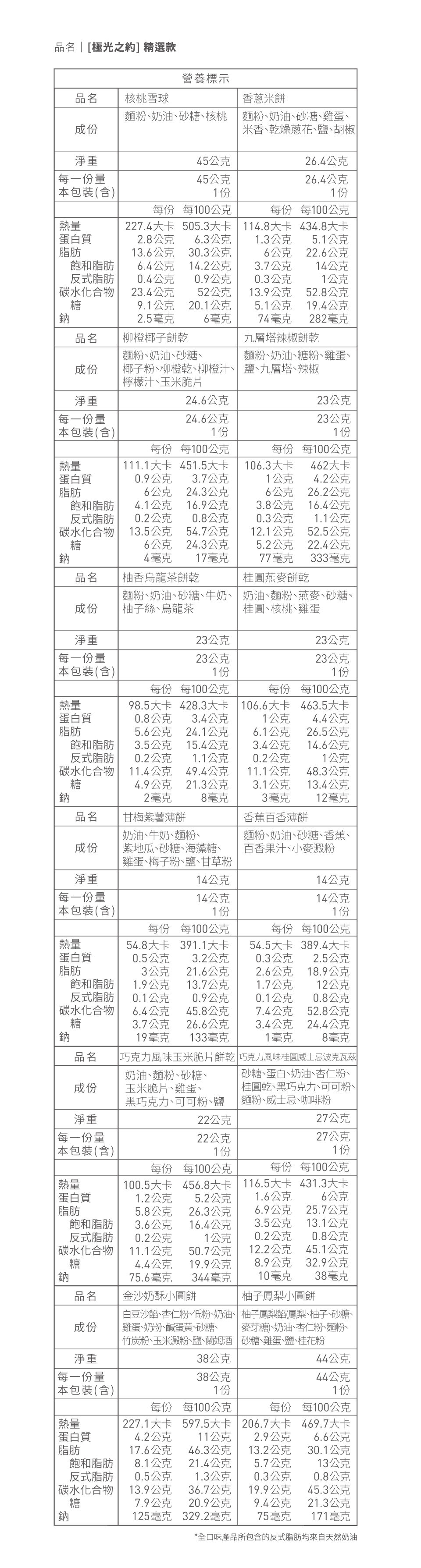 過敏原|麩質穀物(麵粉)、乳製品及雞蛋(除餅乾:柳橙、烏龍、奶油、雪球無蛋),桂圓餅乾、雪球、小圓餅(柚子鳳梨、金沙奶酥)、波克瓦茲含堅果,巧克力玉米脆片、柳橙椰子、巧克力桂圓威士忌含大豆。