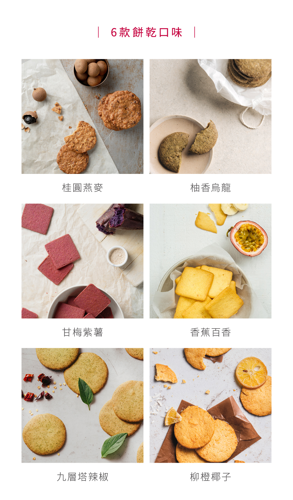 口 味 | 桂圓燕麥、柚香烏龍、甘梅紫薯、香蕉百香、九層塔辣椒、柳橙椰子,各2片。