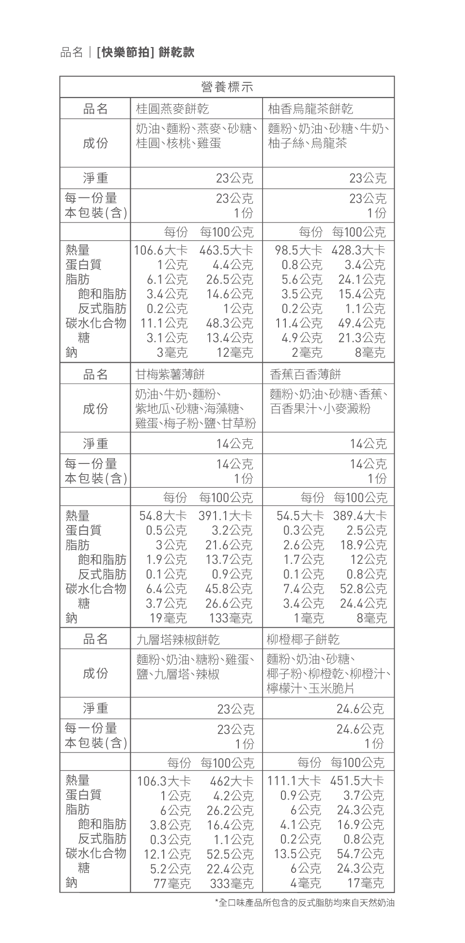 過敏原 | 品項皆含麩質穀物(麵粉)、乳製品及雞蛋 (除餅乾: 柳橙椰子、柚香烏龍、香蕉百香不含雞蛋),桂圓燕麥餅乾含堅果,柳橙椰子含大豆。