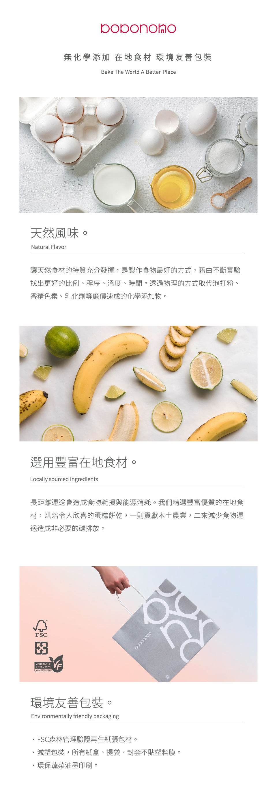 過敏原 | 品項皆含麩質穀物(麵粉)、乳製品及雞蛋 (除餅乾: 柳橙椰子、柚香烏龍、香蕉百香不含雞蛋),桂圓燕麥餅乾含堅果,柳橙椰子含大豆。