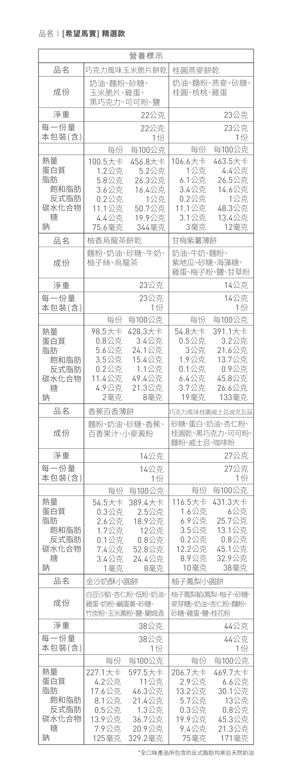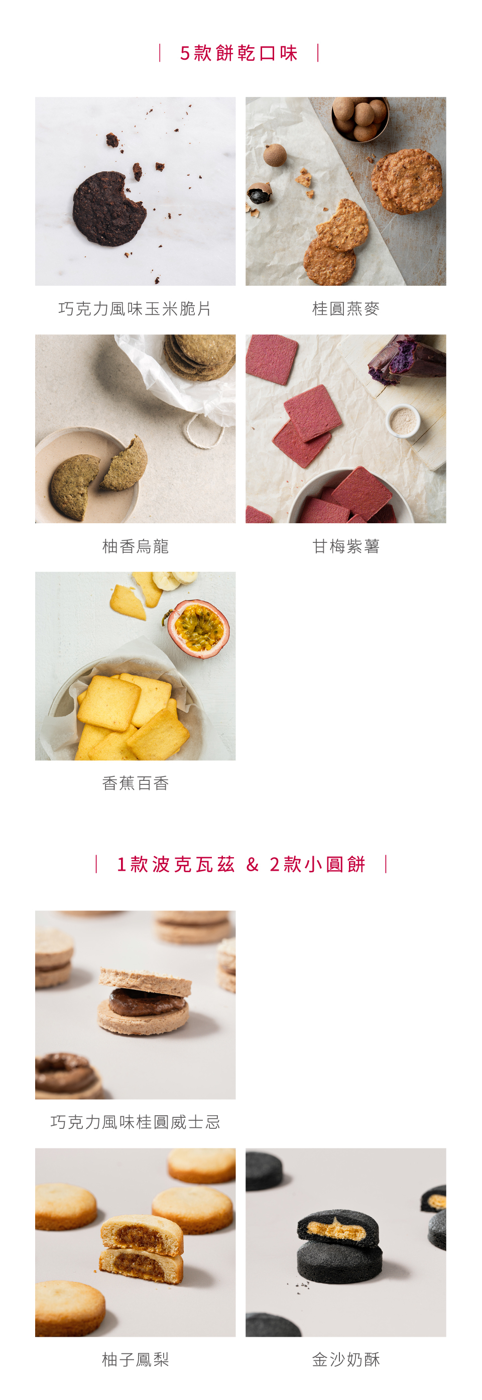 餅 乾 | 巧克力玉米脆片、桂圓燕麥、柚香烏龍、甘梅紫薯、香蕉百香,各2片。