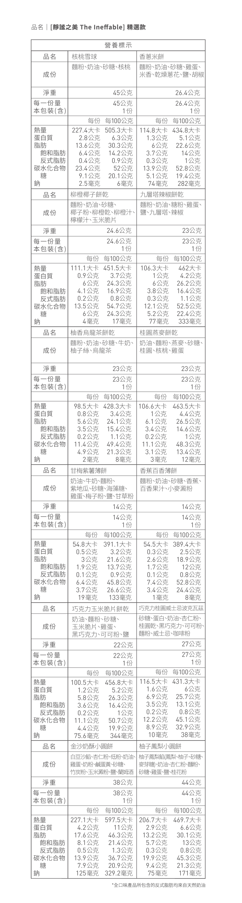 過敏原|麩質穀物(麵粉)、乳製品及雞蛋(除餅乾:柳橙、烏龍、奶油、雪球無蛋),桂圓餅乾、雪球、小圓餅(柚子鳳梨、金沙奶酥)、波克瓦茲含堅果,巧克力玉米脆片、柳橙椰子、巧克力桂圓威士忌含大豆。