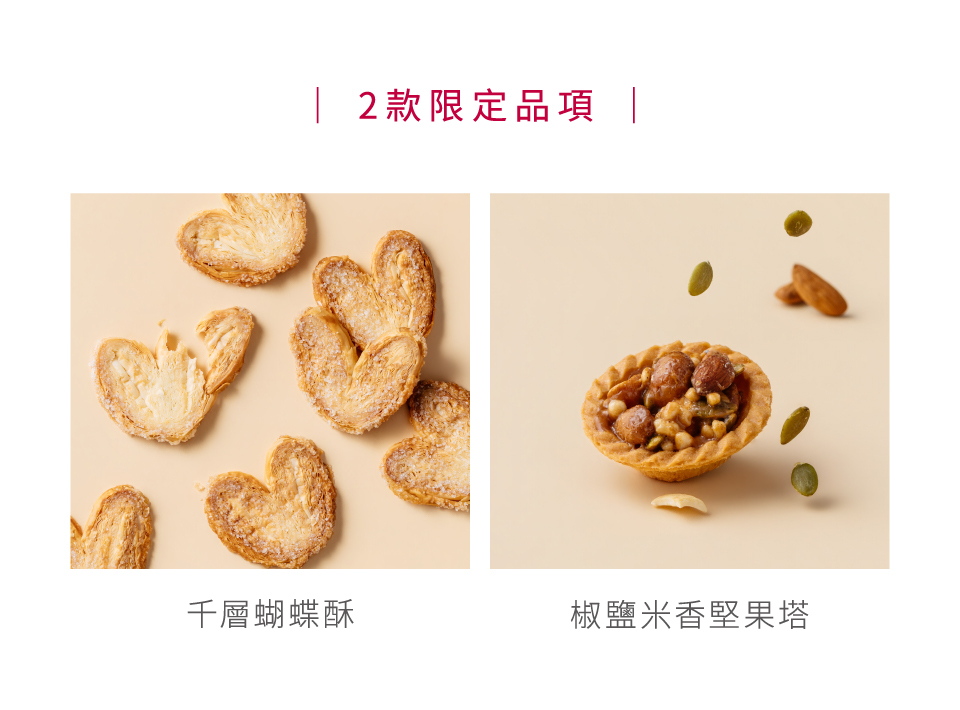 搭配歷時一年研發、挑戰工藝極限的『千層蝴蝶酥』與「椒鹽米香堅果塔」