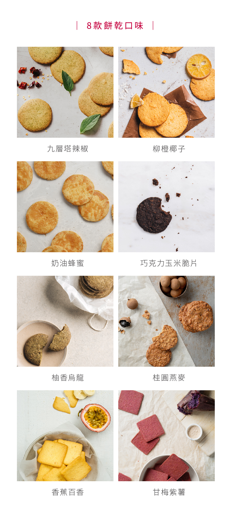 餅乾|巧克力風味玉米脆片、桂圓燕麥、柚香烏龍、奶油蜂蜜風味、甘梅紫薯、香蕉百香、九層塔辣椒、柳橙椰子
