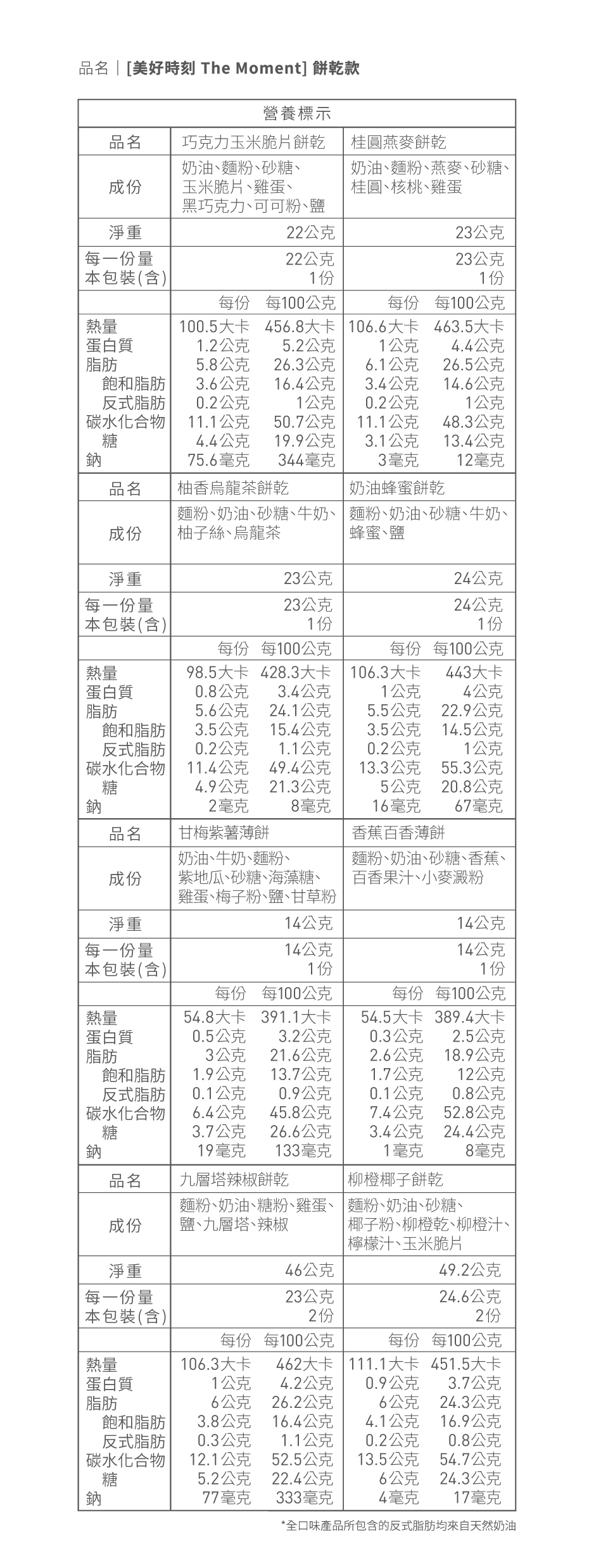 過敏原 | 品項皆含麩質穀物(麵粉)、乳製品及雞蛋(除餅乾:柳橙椰子、柚香烏龍、奶油蜂蜜、香蕉百香不含雞蛋),桂圓燕麥、柳橙椰子含堅果,巧克力風味玉米、柳橙椰子含大豆。