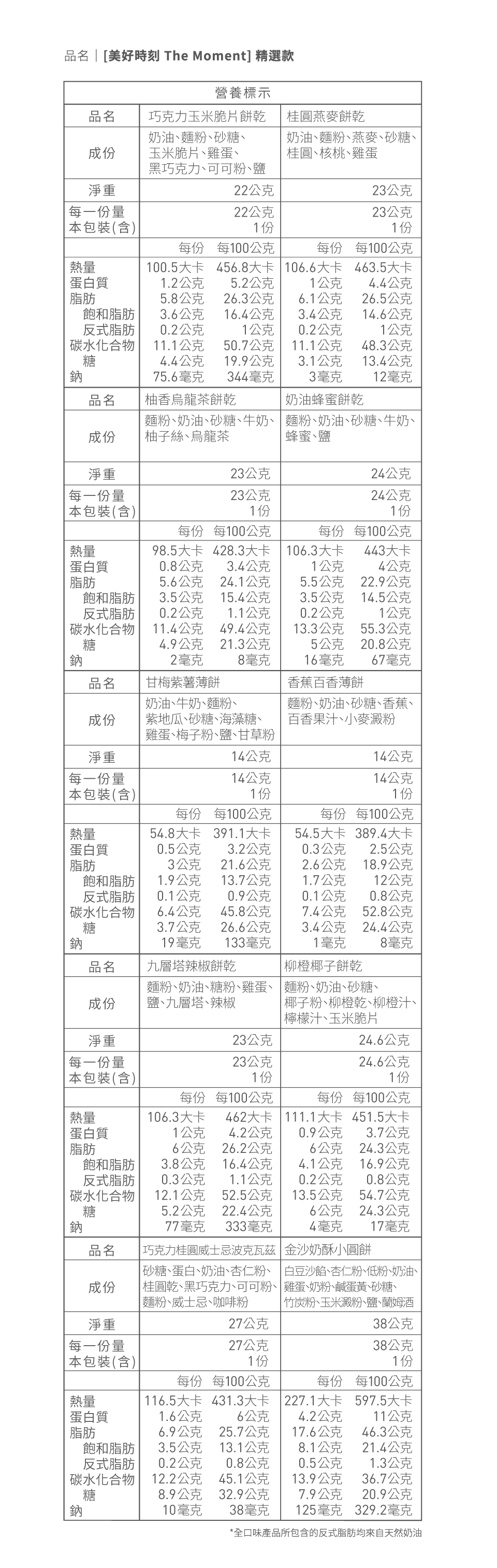 過敏原 |品項皆含麩質穀物(麵粉)、乳製品及雞蛋 (除餅乾: 柳橙椰子、柚香烏龍、奶油蜂蜜、香蕉百香不含雞蛋),桂圓燕麥餅乾及金沙奶酥小圓餅含堅果,巧克力玉米脆片、柳橙椰子、巧克力桂圓威士忌含大豆。
