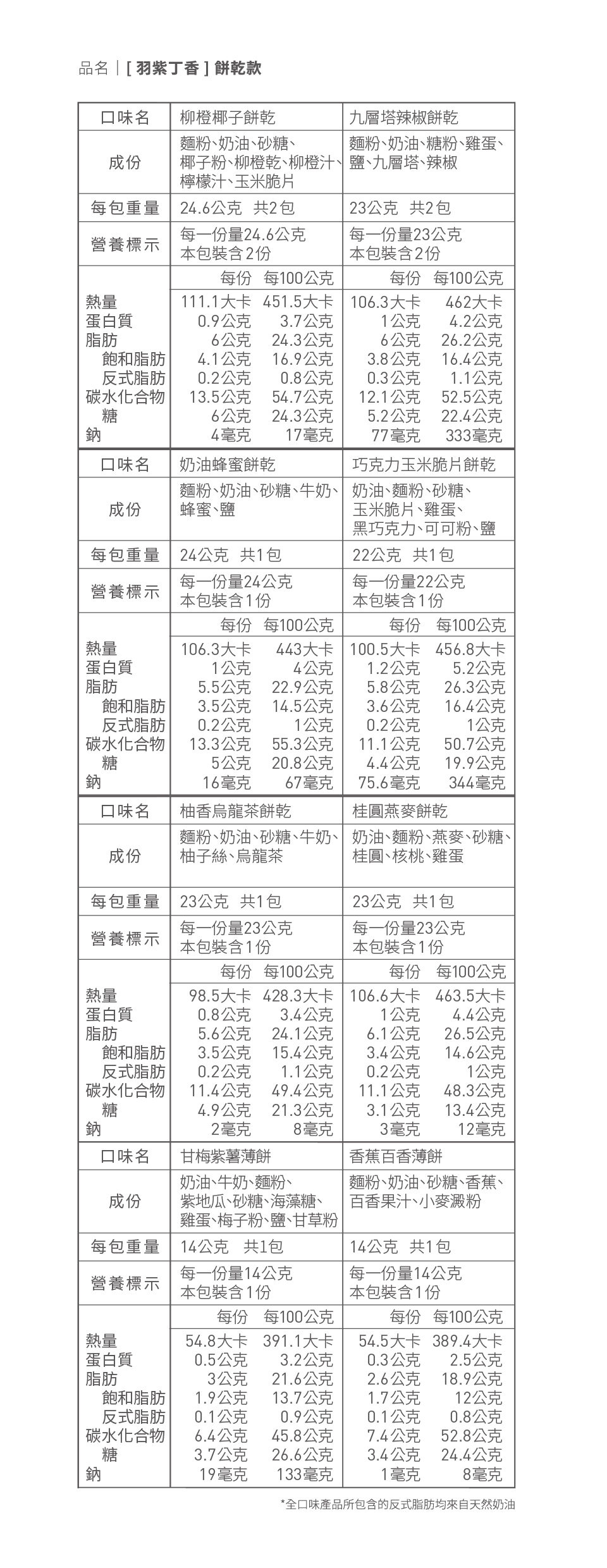 過敏原 | 品項皆含麩質穀物(麵粉)、乳製品及雞蛋 (除餅乾: 柳橙椰子、柚香烏龍、奶油蜂蜜、香蕉百香不含雞蛋),桂圓燕麥、柳橙椰子含堅果,巧克力玉米脆片、柳橙椰子含大豆。
