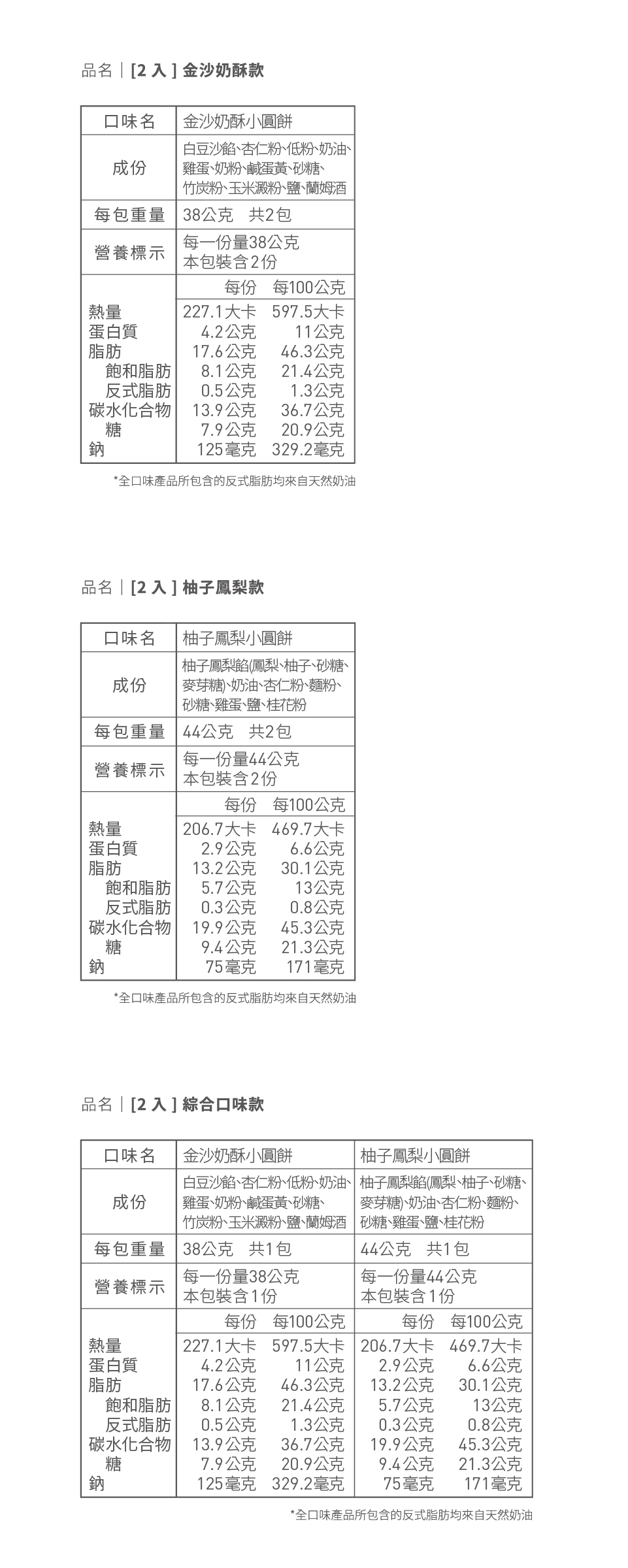 過敏原 | 口味皆含麩質穀物、牛奶製品及雞蛋,兩款小圓餅皆含堅果