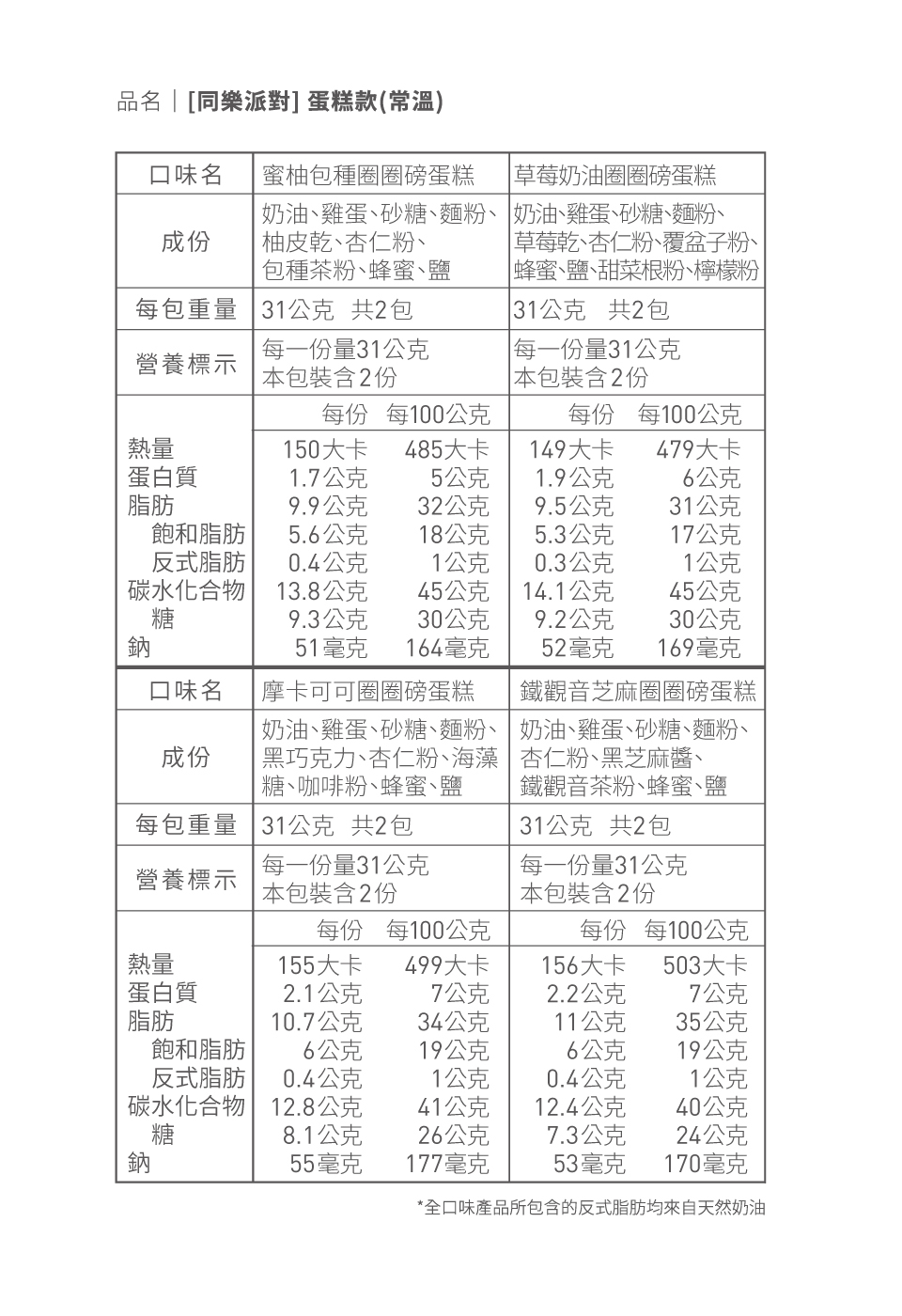 過敏原 |品項皆含麩質穀物(麵粉)、乳製品、雞蛋及堅果,摩卡可可風味含大豆,鐵觀音芝麻含芝麻。