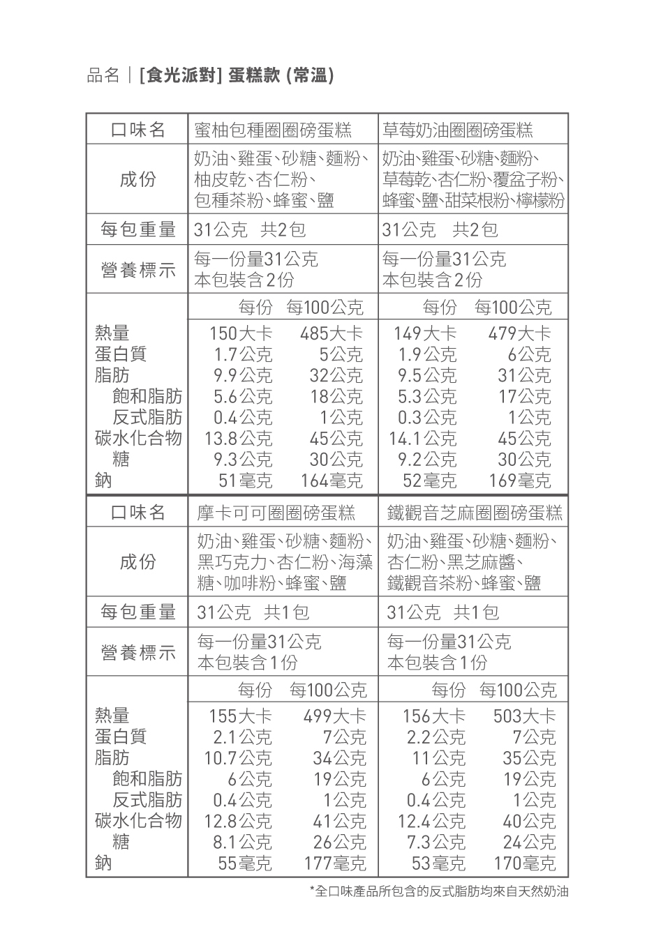 過敏原 |品項皆含麩質穀物(麵粉)、乳製品、雞蛋及堅果,摩卡可可含大豆,鐵觀音芝麻含芝麻。