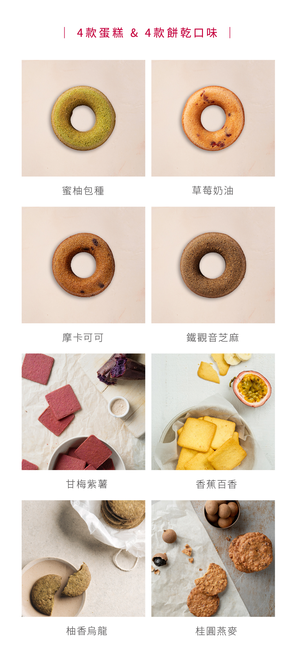 餅 乾 | 桂圓燕麥、柚香烏龍、甘梅紫薯、香蕉百香,各2片。