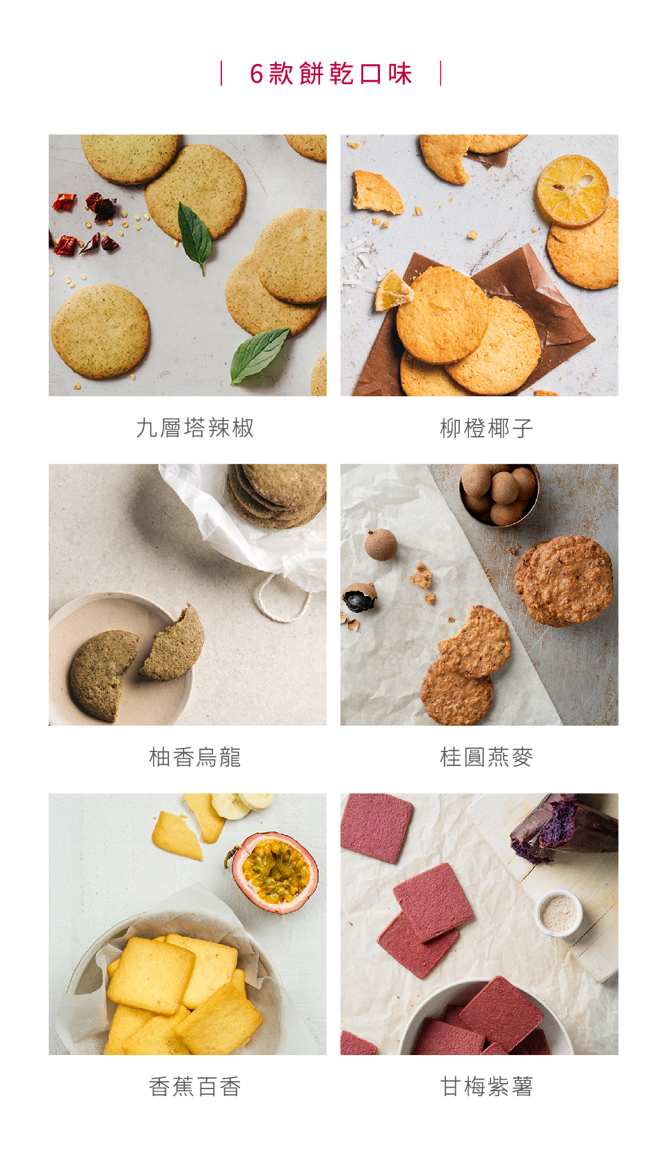 口 味 | 桂圓燕麥、柚香烏龍、甘梅紫薯、香蕉百香、九層塔辣椒、柳橙椰子,各2片。