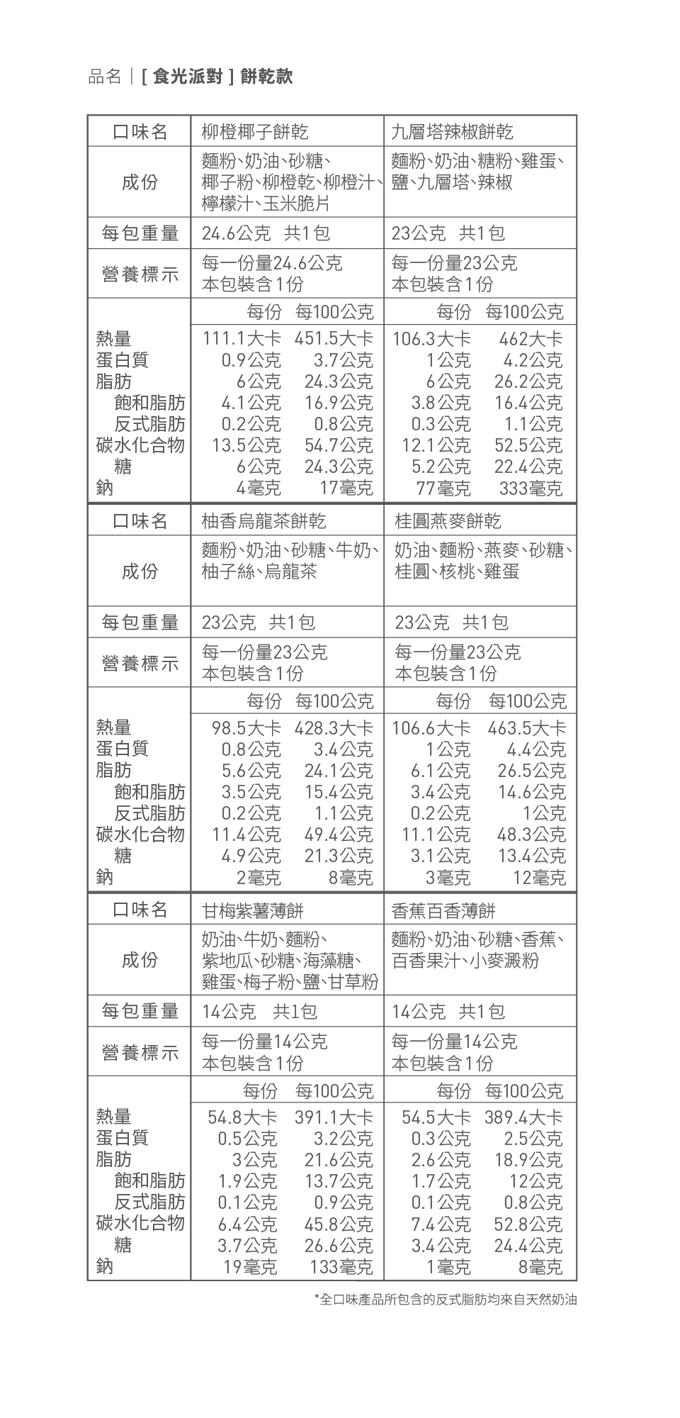 過敏原 | 品項皆含麩質穀物(麵粉)、乳製品及雞蛋 (除餅乾: 柳橙椰子、柚香烏龍、香蕉百香不含雞蛋),桂圓燕麥餅乾含堅果,柳橙椰子含大豆。
